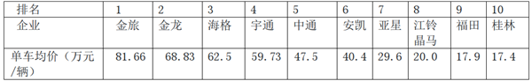 根据统计数据计算,前10名销售业绩企业1-2月单车均价: