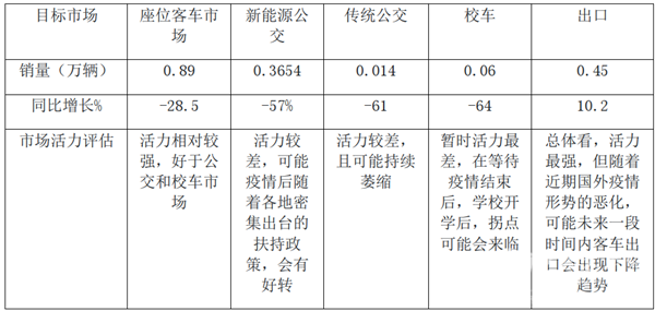 市场活力评估活力相对较强,好于公交和校车市场活力较差,可能疫情后随着各地密集出台的扶持政策,会有好转活力较差,且可能持续萎缩暂时活力最差,在等待疫情结束后,学校开学后,拐点可能会来临总体看,活力最强,但随着近期国外疫情形势的恶化,可能未来一段时间内客车出口会出现下降趋势