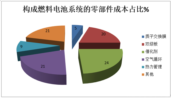 目前,燃料电池汽车产业发展面临一些问题,主要是:核心技术和关键部件缺失,就燃料电池系统技术发展水平来看,国内电堆产业发展较好,但辅助系统关键零部件产业发展落后;系统及整体产业发展较好,但大多采取国外进口(目前氢燃料电池系统的关键零部件核心技术主要掌握在美国、日本、加拿大等国)零部件,对外依存度高,导致氢燃料汽车产业成本太高,其中燃料电池占整车成本的63%,其中四大系统:电堆49%(质子交换膜5%+双极板20%+催化剂24%)、空气循环系统21%、氢气循环系统5%、热力管理系统9%(见下图)。