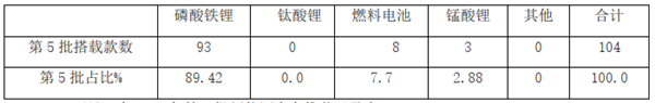 根据2020年第5批《目录》统计,从搭载动力电池来看,本批次入选的新能源客车,其中93款搭载磷酸铁锂电池,0款搭载钛酸锂电池,8款搭载氢燃料电池(注:燃料电池客车1款算2款)