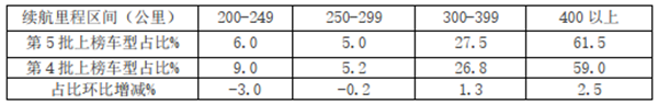 可见,在2020年第5批目录中,续航里程占比呈现的特征是: