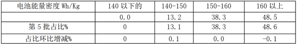 本批次中能量密度在160Wh/Kg以上的占据48.5%,占比环比下降0.1个百分点,其次是能量密度在150-160Wh/Kg之间的占比38.3%,环比几乎未有增长。