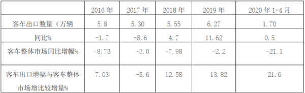 表2:近年客车出口同比增幅与客车整体市场增幅比较