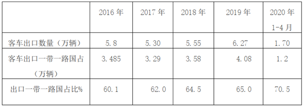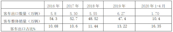 而近年我国出口海外市场确实另外一番景象,特别是最近的2018年、2019年及2020年1-4月,客车出口增幅远大于当年客车整体市场的增幅(表2),客车出口占据客车整体销量的比例近年也越来越大(表3).