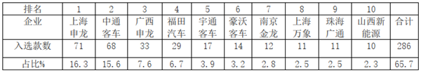 上海申龙客车上榜71款位居榜首;中通客车以68款登榜位居第二;广西申龙(紫像牌)以33款上榜夺得季军;前10名基本被主流车企占领,累计占比超6成,达到65.7%。