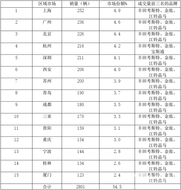 根据上牌信息,2020年1-5月,考斯特流向前15名区域销量统计: