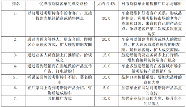 上表对考斯特客车市场成交的主要方式分析,给车企如何制定2020年后期考斯特客车市场推广宣传策略从而达成最高成交量提供了具体的实战依据。