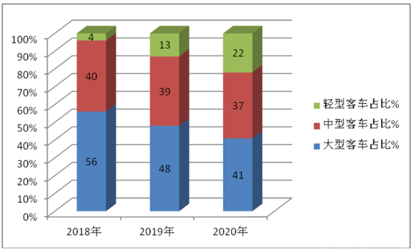 二、按大中轻型划分,从2018年到2020年,大中型客车占比最大,中型客车占比次之,轻型客车占比最小;大中型客车占比逐年减少,轻型正好相反