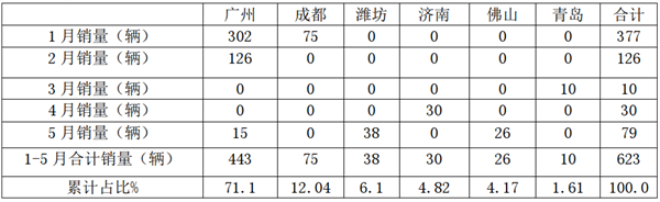 根据上牌信息,2020年1-5月,氢燃料电池客车只在广州、成都等六个区域市场有上牌,全国其他地区均为零