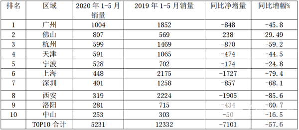六、区域流向不平衡。1-5月TOP10 中,广州拔得头筹,广州、佛山、杭州、天津和宁波分别占据前5名,佛山是同比唯一正增长的城市,TOP10 累计占比超3成,销量累计同比下降57.6%