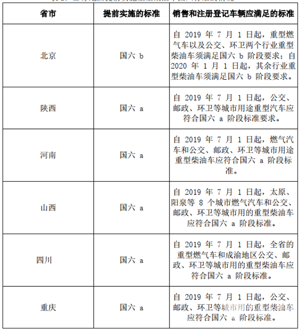 表2:部分地区提前实施重型柴油车国六标准的情况