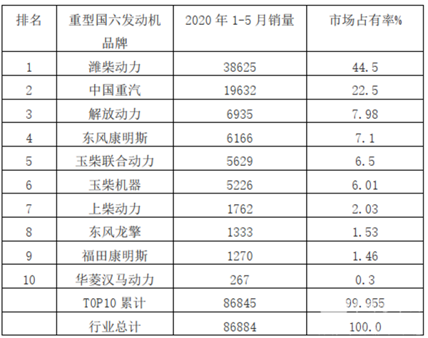 1、2020年1-5月国六重型车发动机(含燃气类及柴油类)销量及占比: