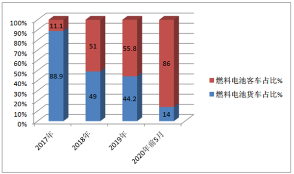 从2019年销量来看,我国燃料电池汽车销量增速明显,全年销售2737辆(图1),同比增长79.2%,主要是商用车领域的氢燃料电池货车和燃料电池客车,特别是近年燃料电池客车占比越来越大(图2)。在燃料电池商用车中,燃料电池客车占比从2017年的11.1%逐年提高到2020年的86%。也就是说,今后一段时间内,我国建设的加氢站主要是为氢燃料电池客车加氢提供服务的。