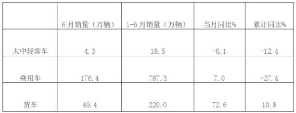 根据中汽协数据,6月及1-6月大中轻客与乘用车、货车销量及同比: