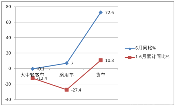 特点四、从整个汽车市场看,6月大中轻客销量同比降幅最大,1-6月大中轻客销量同比降幅处于次大