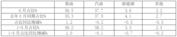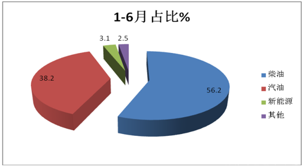 根据上牌数据,2020年6月及1-6月按照动力种类划分,其销量结构占比及同比变化: