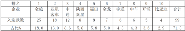 厦门金旅客车上榜25款位居老大;扬州亚星客车以18款登榜位居亚军;中通客车以12款上榜夺得亚军;前10名基本被主流车企占领,累计占比超7成,达到71.3%。