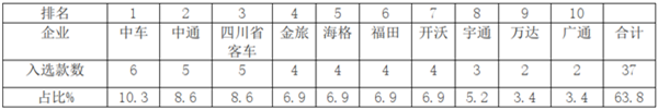 中车电动客车上榜6款位居老大;中通客车和四川省客车公司分别以5款登榜位居亚军;金旅、海格、福田、开沃客车均以4款上榜夺得亚军;前10名基本累计占比超6成,达到63.8%