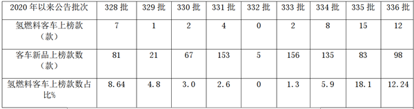 可见,本批次(336批)公告中上榜的燃料电池客车数量为12款,占据客车产品上榜总数量的12.24%;在2020年以来的共计9批次客车新品公告中,燃料电池客车新品无论是上榜款数,还是占比,本批次均为次高。