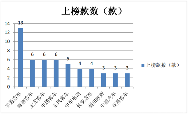 特点四、上榜企业中,宇通上榜数量位居第一;海格、金龙、中通并列第二;东风客车位列第三;TOP10主流企业累计占比超5成