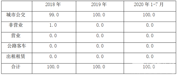 根据中国汽车流通协会市场研究统计数据,2020年1-7月及近年新能源客车按用途划分销量权重结构如下: