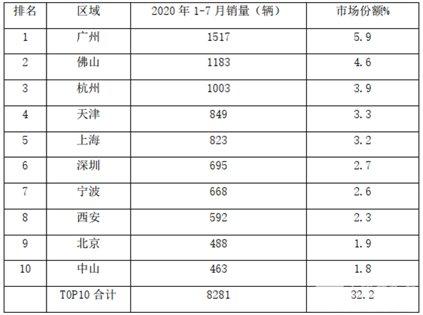 2020年前7月新能源客车主要流向广州、佛山、杭州等区域,广州占比最高。TOP10累计占比32.2%。这给下一步车企拓展新能源客车市场如何制定区域市场策略提供了参考。