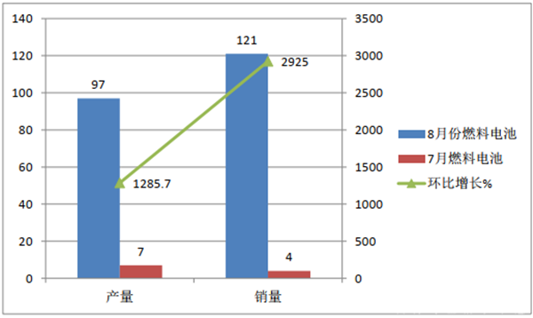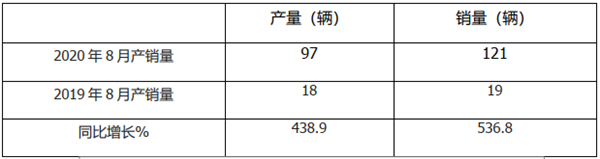 根据中汽协数据,2020年8月燃料电池汽车(客车)产销分别完成产销97辆和121辆,相对7月呈现暴涨态势。