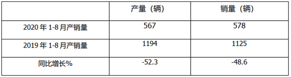 特点三、2020年1-8月燃料电池客车产销同比仍然是较大幅度的负增长
