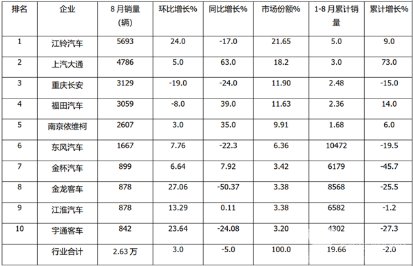 江铃汽车销量是8月唯一超5000辆的企业,也是占比唯一超2成(21.65%)的品牌;上汽大通销量是4786辆,占比18.2%,位居第二;长安汽车销量3129辆,占比11.9%,居第三;