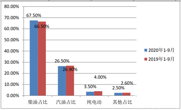 上牌数据显示,2020年1-9月及2019年同期,农村客运市场中销量占比最大的是柴油动力车型,其次为汽油。柴油占比近7成,且同比增加1.0个百分点。
