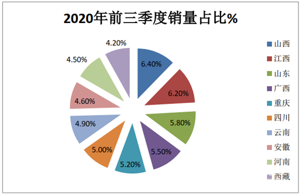 三、2020年前三季度,农村客车销量区域流向不均,TOP10 中,山西占比最大,西藏占比同比增加最多;TOP10累计占比超半壁江山,同比增加3.6个百分点