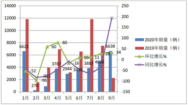 可见,在2020年1-9月新能源客车市场中,9月销量6638辆,处于单月最高,环比增长34%,同比增长194%,是环比、同比唯一双增长的月份,这是个比较明显的市场特征,说明9月新能源客车市场回暖非常明显,“金九”终于不负众望!