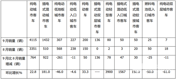表2:根据上牌数据,2020年9月新能源客车按产品类别划分,其销量与8月销量比较及环比
