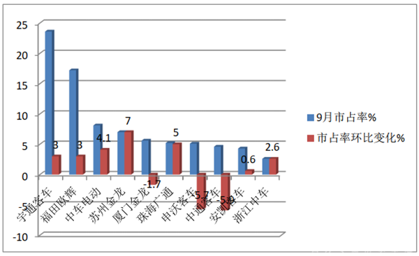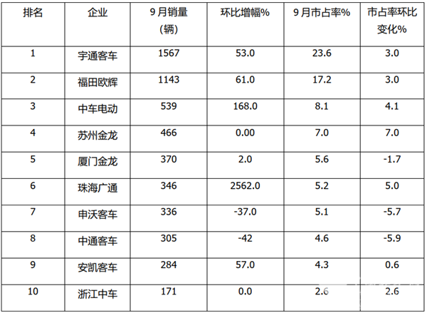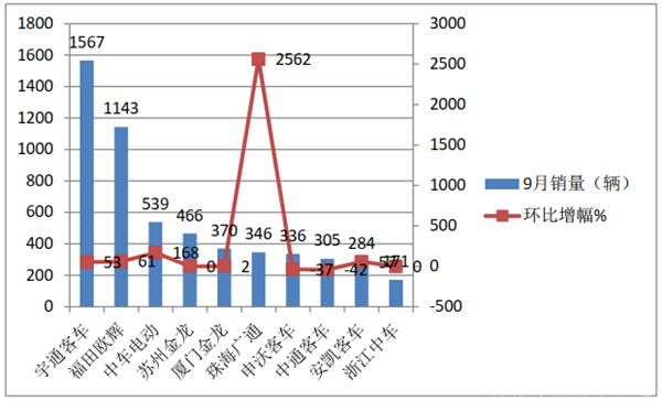 金龙、广通、申沃分别依靠在苏州、北京、上海等地上牌而排名也比较靠前,并且广通客车9月环比增幅达到25.62倍,环比最大。