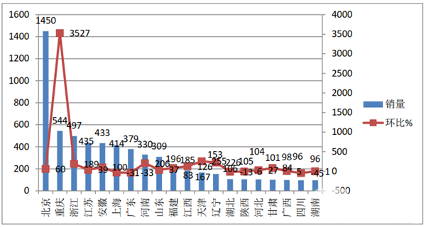 特征四、从9月新能源客车全国区域流向看,北京地区第一,重庆第二,浙江第三,江苏第四,安徽第五;TOP20区域中,15个区域省市销量环比正增长,5个区域环比负增长