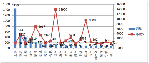 特征五、从具体流向城市来看。9月新能源客车销量最多的是北京,第二是重庆,第三是上海第四是杭州,第五是商丘,第六是盐城第七是天津,第八是合肥,第九是福州,第十是泰安;TOP20城市中,环比最大的是福州,环比增幅达到139倍,其次是深圳环比增幅达到96倍,再次是商丘,环比达到近70倍
