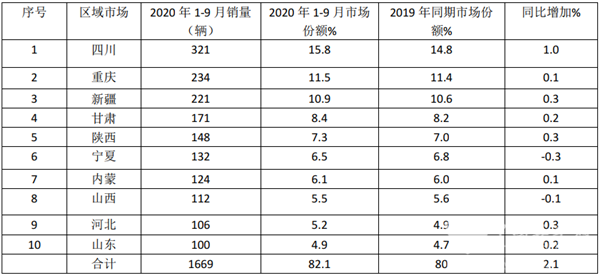 特点三、从区域流向看,2020年前三季度国六天然气客车销量主要扎堆在天然气资源比较丰富、加气站网点比较多的四川、重庆、新疆等区域;四川占比最高,且同比增加最多;TOP10累计占比超8成,且同比增加3.2个百分点,市场集中度进一步提高