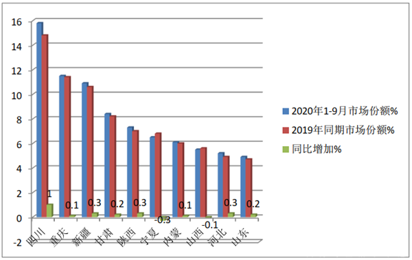 国六天然气客车不像新能源客车那样主要分布在长三角和珠三角等发达地区,2020年前三季度国六天然气客车主要扎堆在天然气资源比较丰富、加气站网点较为密集的四川、重庆、新疆、甘肃、陕西、宁夏等区域。其中四川占比最高,达到15.8%,且同比增加1.0个百分点(增加最多),重庆、新疆分别位居第二和第三,TOP10累计占比超8成(82.1%),且同比增加2.1个百分点,区域市场集中度进一步提高。