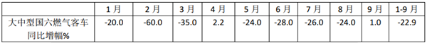 根据中汽协数据统计,2020年1-9月各月国六天然气客车销售同比增幅: