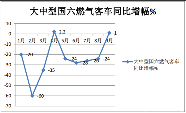 特点四、从前三季度各月同比增幅看,国六天然气客车市场跌宕起伏、一波三折,就像过山车——1-3月“三连降 ”;4月同比增长;5月、6月、7月、8月“4连降”,9月同比微增