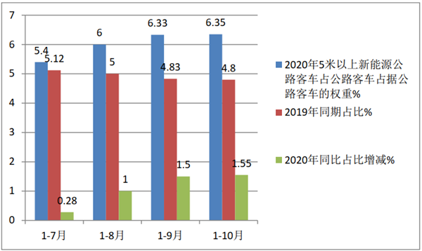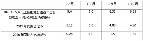 其次,纯电动公路客车参展车型占比四分之一(25%),处于次要地位,但比去年的北京道展比例(去年纯电动公路客车参展车型只有15%的比例)提高了10个百分点,说明纯电动公路客车越来越受到车企重视,毕竟纯电动公交客车前几年市场透支比较严重,今后市场发展空间比较有限,而纯电动公路客车市场近年没有得到开发,未来市场发展空间较大,尤其是随着充电桩新基建的逐渐落地及电池技术的不断提升,“续航焦虑”和“有车无桩”的尴尬局面会逐渐得到缓解,纯电动公路客车市场会越来越宽,这是纯电动客车市场的发展趋势。从下表我们不难看出,今年近几个月纯电动公路客车市场占比逐月增加的客观现实也证明了这一点。