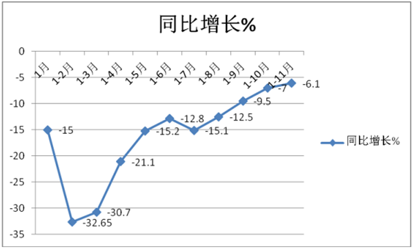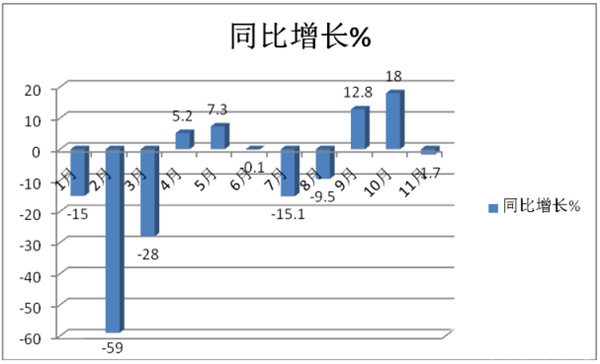 根据中汽协数据统计,2020年1-11月各月客车销售同比增幅: