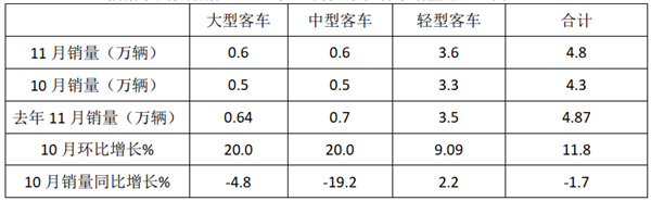 特点二、11月客车环比增长11.8%,同比微降1.7%;从细分市场看,大中型客车销量同比均下降,其中大型客车同比下降4.8%,中型客车同比下降19.2%;轻型客车同比增长2.2%