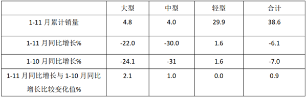 总体看1-11月,客车市场销量比1-10月降幅收窄,继续向好趋势发展。
