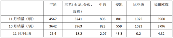 根据各家的11月产销快报数据,6家主流客车上市公司与10月销量环比: