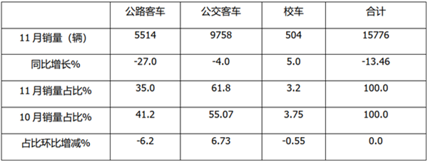 校车同比虽然微增长5%,但其占比太小,且占比环比减少0.55个百分点因此,对11月的客车整体市场影响不大。
