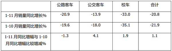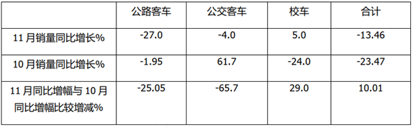 由上表可见,11月公交客车同比增长-4%,比10月同比61.7%的增幅低65.7个百分点,是三大细分市场增幅收窄最大的;而公路客车与10月比,同比降幅扩大了25.05个百分点;而校车11月增幅相对比10月扩大29个百分点。