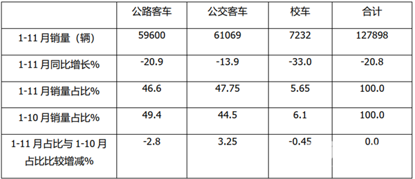 根据中国客车统计信息网数据,2020年1-11公路客车、公交客车、校车销量同比、占比: