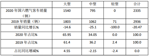 2020年前燃气客车市场同比下降20.47%,,比大中型客市场降幅小6.13个百分点,也就是2020年国六天燃气客车市场跑赢大中型客车整体市场。