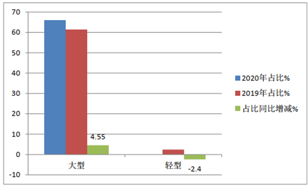 特点二、2020年大型国六燃气客车销量同比降幅最小,占比最大,且占比同比增加最多,中型客车占比减少最多